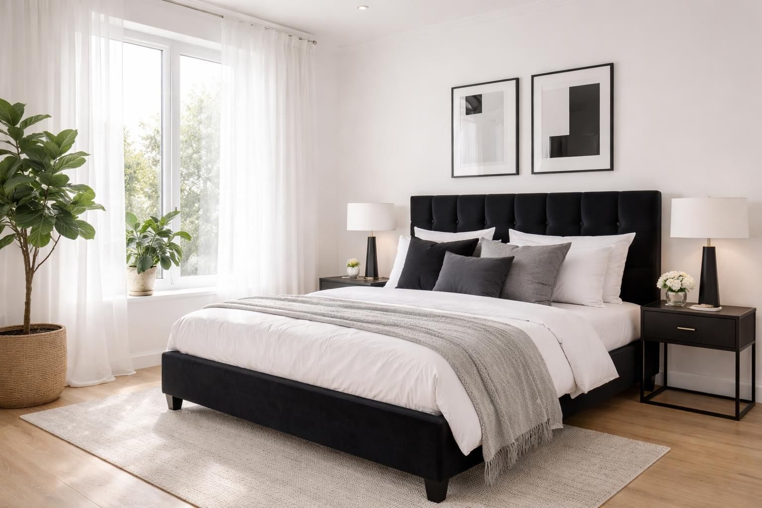 Une répartition judicieuse des couleurs est primordiale. Par exemple, on peut peindre un seul mur en noir derrière la tête de lit. Cette méthode donne du caractère sans assombrir l’ensemble de la chambre. En outre, l’emploi de textiles et de mobiliers dans des tons clairs permet d’équilibrer l’effet du noir. Des éléments comme des coussins crème ou un linge de lit pastel, lorsque associés à des murs noirs, favorisent une ambiance lumineuse.