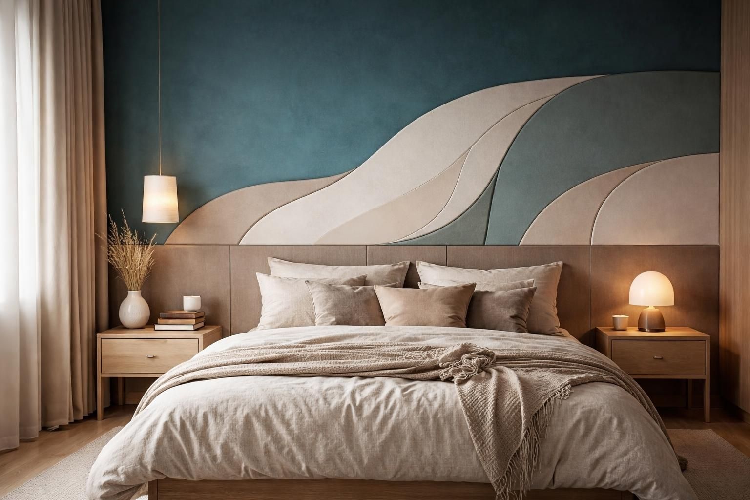 Il existe de nombreuses manières de compléter une tête de lit bleue canard. Des coussins dans des tons complémentaires, tels que le jaune moutarde ou le rose poudré, peuvent rehausser les nuances du mur. L’association avec des textures variées, comme le velours ou le lin, contribue à donner une dimension supplémentaire à la décoration.